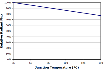 圖3. XLamp7090XR-E的相對光輸出隨結(jié)溫的升高而降低