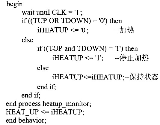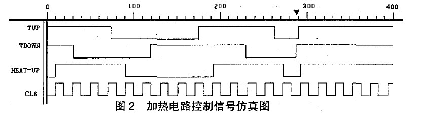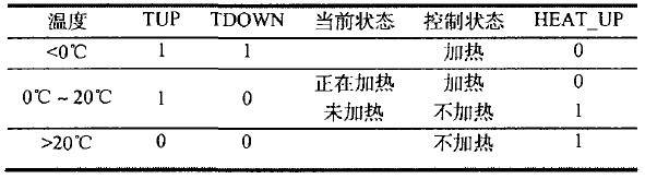 當(dāng)環(huán)境溫度低于0℃ ,此時(shí)TUP與TDOWN均為高電平,F(xiàn)PGA/CPLD輸出高電平HEAT_UP,加熱電路工作。當(dāng)環(huán)境溫度介于0℃與20℃之間時(shí),如果此時(shí)正在加熱,則繼續(xù)加熱,如果當(dāng)前未加熱,則無(wú)需加熱。當(dāng)環(huán)境溫度高于20℃時(shí),則停止加熱。