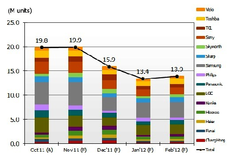 NPD DisplaySearch認(rèn)為,盡管北美和中國大陸的銷售實(shí)績強(qiáng)勁,液晶電視品牌商仍謹(jǐn)慎管控庫存。從12月到 2012年2月,液晶電視品牌計(jì)劃降低生產(chǎn)數(shù)量以預(yù)防在傳統(tǒng)的第一季淡季堆積過多的庫存。在全球液晶電視品牌生產(chǎn)計(jì)劃調(diào)查中顯示, 2012年1月的整機(jī)生產(chǎn)量將降到1,340萬臺(tái)的數(shù)量,而液晶電視面板業(yè)者則將需在未來的幾個(gè)月持續(xù)控制產(chǎn)能利用率,即使面板價(jià)格轉(zhuǎn)為穩(wěn)定。