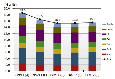 可攜式個(gè)人電腦品牌各月出貨預(yù)測數(shù)量 (單位:百萬臺(tái))