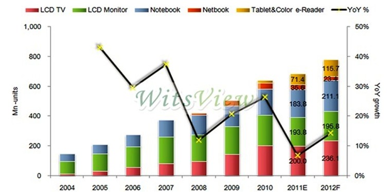 在low cost direct type LED TV、 3D TV 、super narrow bezel、 LED Monitor 、ultra slim module、high resolutiON、new TV sizes、high transmittance panel、 Windows 8 等新產(chǎn)品及新作業(yè)系統(tǒng)的帶動(dòng)下,WitsView對(duì)于2012年大尺寸面板的需求抱持著審慎而樂觀的看法,預(yù)估年成長率將達(dá)12~14%,面板總量上看7億8,000萬片,其中平板電腦及彩色閱讀器面板的年成長率仍將超過60%,達(dá)1億1,500萬片。