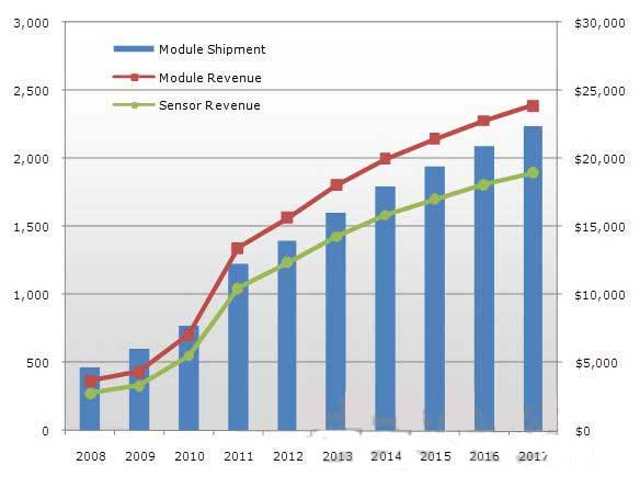 2011年的觸摸面板因智能手機(jī)市場的增長而“風(fēng)光無限”。據(jù)美國FPD相關(guān)調(diào)查公司DisplaySearch預(yù)測,2011年全球智能手機(jī)面板市場與上年相比將實(shí)現(xiàn)90%以上的迅猛增長,并且預(yù)測在2015年之前還將以年均43%的速度增長。由于智能手機(jī)市場迅猛增長,輸入和操作所需的觸摸面板市場隨之迅速擴(kuò)大。據(jù)DisplaySearch介紹,觸摸面板的整體市場規(guī)模2011年達(dá)到了12億片,超過130億美元。預(yù)計(jì)按數(shù)量計(jì)算將比上年大幅增長60%,按金額計(jì)算將大幅增長90%(圖1)。
