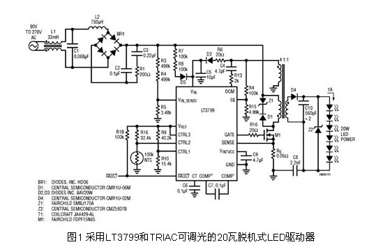 為了滿足脫機式照明的要求,例如高功率因子、高效率、隔離和TRIAC調(diào)光器兼容性,先前的LED驅(qū)動器采用很多外部分立式組件,結(jié)果形成了既龐大又復雜的解決方案。而最新的驅(qū)動器LT3799則整合了脫機式LED照明需要的所有功能,解決了相關(guān)復雜性、空間和效能問題。LT3799是一款具主動功率因子校正的隔離反馳式LED控制器,專門為在90~265VAC的通用輸入范圍驅(qū)動LED而設(shè)計。該組件以關(guān)鍵導通(邊界)模式控制一個隔離反馳式轉(zhuǎn)換器,適用于需要4~100瓦或更高LED功率的LED應(yīng)用。其新穎的電流檢測電路無須使用光耦合器,就能向二次側(cè)提供良好調(diào)節(jié)的輸出電流。其獨特的泄能(Bleeder)電路使得LED驅(qū)動器可與TRIAC調(diào)光器兼容,而無須增設(shè)額外的組件。LED開路和短路保護則可確保長期可靠性。