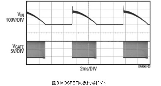 當TRIAC調(diào)光器處于斷開狀態(tài)時,其實不是徹底斷開的。有相當大的漏電流通過其內(nèi)部濾波器流至LED驅(qū)動器。這個電流為LED驅(qū)動器的輸入電容器充電,進而導致LED隨機開關(guān)和閃爍。過往的解決方案是增加一個泄能電路,該電路包括一個大且昂貴的高壓金屬氧化物半導體場效晶體管(MOSFET)。LT3799將變壓器一次側(cè)繞組和主開關(guān)用作泄能電路,因此無需這類MOSFET或其他任何額外的組件。如圖3所示,當TRIAC斷開時,MOSFET閘極訊號為高,且MOSFET接通,進而泄放掉漏電電流,并保持輸入電壓為 0伏特(V)。TRIAC一導通,MOSFET就無縫地變回正常的供電組件。