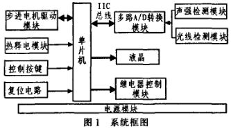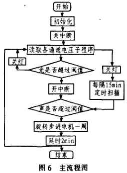 本系統(tǒng)以單片機(jī)AT89S52為核心,采用光照檢測、聲控以及步進(jìn)電機(jī)旋轉(zhuǎn)熱釋電紅外等傳感器進(jìn)行環(huán)境探測。系統(tǒng)首先啟動可見光模塊,通過光一流一壓轉(zhuǎn)換后,經(jīng)過A/D轉(zhuǎn)化為數(shù)字量并通過液晶顯示。若是電壓較小,說明了亮度不夠,則繼續(xù)檢測聲音。若是聲音較大,則在短時間內(nèi)調(diào)用步進(jìn)電機(jī)模塊,檢測是否有人;否則,每隔15 min定時檢測。因為在實際過程中,設(shè)置聲光的閾值都缺乏直觀性,所以使用液晶電壓顯示進(jìn)行判斷。光、聲的閾值可以根據(jù)不同地方的實際情況通過軟件進(jìn)行調(diào)整。