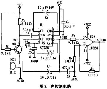 從麥克風(fēng)接收到信號后由三極管9013初次放大,然后由集成放大器LM324的兩級放大,得到交流電壓。由于模數(shù)轉(zhuǎn)換時需要直流電壓值,所以再通過萬用表交直流轉(zhuǎn)換電路,選用整流芯片AD736,使用單電壓供電低阻抗電路。