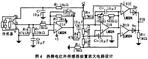 熱釋電紅外傳感器能以非接觸形式檢測出人體輻射的紅外線,并將其轉(zhuǎn)變?yōu)殡妷盒盘枴1驹O(shè)計所采用的是PIR熱釋電傳感器,安裝有菲涅爾透鏡,感應(yīng)距離7 m,感應(yīng)角度110°。具有全自動感應(yīng)、光敏控制、兩種觸發(fā)方式(不可重復(fù)觸發(fā)方式,可重復(fù)觸發(fā)方式)、靈敏度高、微功耗等特點。當(dāng)人進(jìn)入其感應(yīng)范圍,則輸出高電平,人離開感應(yīng)范圍,則自動延時關(guān)閉高電平,輸出低電平。但是該熱釋電紅外傳感器只能檢測到動態(tài),所以對于長時間處于相對靜態(tài)的存在無法檢測的缺陷。熱釋電紅外傳感器前置放大電路如圖4所示。