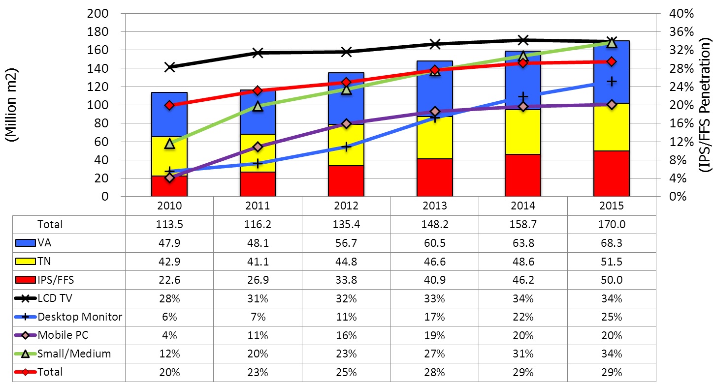 在中小尺寸面板市場,IPS/FFS LCD面板持續被使用在智能型手機、數碼相機、車用顯示器、攝錄像機及平板計算機上,。因為這些應用需要高影像質量來展現相片及影片。因此NPD DisplaySearch預期IPS/FFS在這些市場滲透率將持續提高。