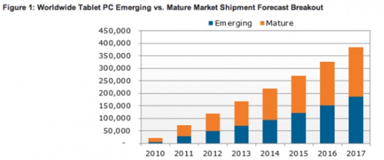 雖然那些數據本身就已十分驚人,但更令人關注的是,大多數新增的銷量將主要來自新興市場。預計到2017年,新興市場上平板電腦的銷量所占份額將由2011年的36%上升到到46%。