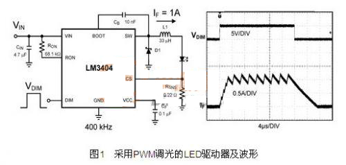 無論LED是經由降壓、升壓、降壓/升壓或線性穩壓器驅動,連接每一個驅動電路最常見的線程就是須要控制光的輸出。現今僅有很少數的應用只需要開和關的簡單功能,絕大多數都需要從0~100%去微調亮度。目前,針對亮度控制方面,主要的兩種解決方案為線性調節LED的電流(模擬調光)或在肉眼無法察覺的高頻下,讓驅動電流從0到目標電流值之間來回切換(數字調光)。利用脈沖寬度調變(PWM)來設定循環和工作周期可能是實現數字調光的最簡單的方法,原因是相同的技術可以用來控制大部分的開關轉換器。