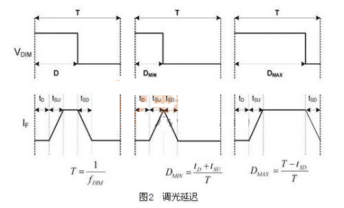 對于PWM調光訊號而言,每個LED都有限定的響應時間,圖2表示三種不同的延遲,延遲愈大者表示能達到的對比度就愈低(對光強度控制的一種測量方法)。