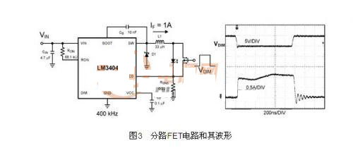 從一個沒有輸出電容器的快速降壓穩壓器著手,出現在輸出電流開啟和關閉的延遲,是來自集成電路本身的傳導延遲和輸出電感器的物理特性。若要達到真正高速的PWM調光,兩個延遲都須被略過(By Pass)。要實現這個目標,最佳方法就是采用一個與LED并聯的電源開關(圖3)。當LED關閉時,驅動電流便會分流通過開關,作用就如同一個典型的N型金屬氧化半導體場效晶體管(N-MOSFET),這時集成電路會繼續運行,而電感器電流也會持續流動。該方法的最大缺點在于LED關閉時,即使期間的輸出電壓下降到與電流感測電壓相同,仍會浪費功率。