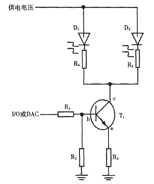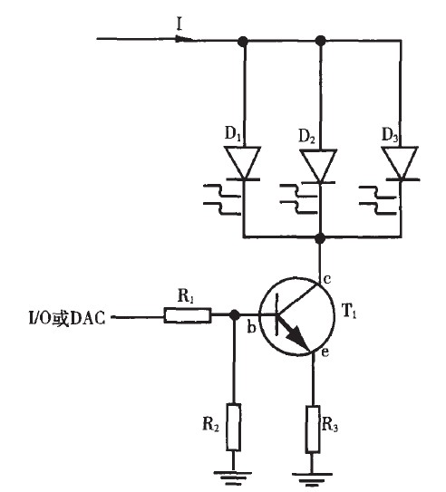 圖中, D1, D2, D3 為發光二極管, T1 為NPN 型三極管, R1 , R2 , R3 的阻值可根據總電流I 的設計要求進行調節, I/O 或DAC 為控制端口。