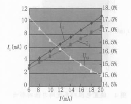 根據式(2),也可以通過改變LED 的發光亮度來改善LED 背光源的亮度均勻性,即通過改變系統的總電流來改善亮度的均勻性。本文討論兩個LED并聯,且外加68Ω偏置電阻的情況,結果如表3 及圖6 所示。