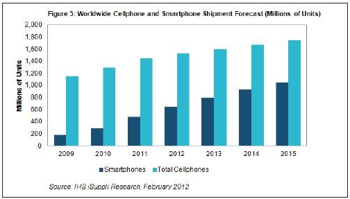 IHS公司的資深首席分析師Steve Mather 認(rèn)為,2015年全球手機(jī)銷量將達(dá)17億部,其中10億部將是智能手機(jī)。這意味著2015年超過70億的人口中,14%將購買智能手機(jī),如圖3所示。這個規(guī)模十分驚人,全球科技供應(yīng)鏈紛紛調(diào)整方向,脫離電腦產(chǎn)業(yè),投身于智能手機(jī)市場。時間框架:三年。