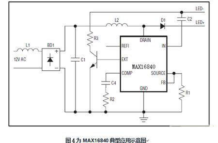 而MAX16840芯片有3個(gè)重要引腳功能:FB引腳電壓可檢測(cè)輸入電流,并調(diào)節(jié)其平均值;而輸入引腳(REFI)用于設(shè)置輸入電流值,引腳電壓低于特定門(mén)限時(shí),輸入電流與該電壓成正比,電壓超過(guò)特定門(mén)限時(shí),輸入電流將置于固定的預(yù)置水平。據(jù)此利用REFI的非線性特性,連接一個(gè)NTC電阻,即可得到熱折返保護(hù);IN引腳具有內(nèi)部過(guò)壓保護(hù),避免內(nèi)部開(kāi)關(guān)MOSFET在LED串開(kāi)路或LED串電壓過(guò)高時(shí)損壞;它帶有一個(gè)獨(dú)立的EXT引腳,確保低輸入電壓開(kāi)啟時(shí)提供一個(gè)觸發(fā)啟動(dòng)電流,以配合電子變壓器正常工作。EXT驅(qū)動(dòng)外部npn晶體管,一旦IN跌落到5.5V UVLO門(mén)限以下,將EXT拉至地電平,外部npn晶體管關(guān)斷。其IC采用3mm x 3mm、10引腳、TDFN封裝,-40°C至+125°C工作溫度范圍。圖4為MAX16840典型應(yīng)用示意圖。它被廣泛應(yīng)用于MR16及其它12V交流或直流輸入LED照明之中。