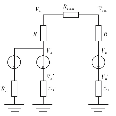 的微小值。由式(6)可以看出,當(dāng)gm1ro2或gm2越大,VA與VB的匹配度越高,電流采樣越精確。值得注意的是,式中出現(xiàn)gm1ro3的平方項,這意味著可以用較小的增益達(dá)到高精度。但是,耐壓5 V的低壓管無法在高輸入電壓下正常工作,電路中必須使用大量耐壓40 V的高壓管。然而高壓管的增益與等效輸出電阻很低,無法滿足電流采樣電路的精度要求。