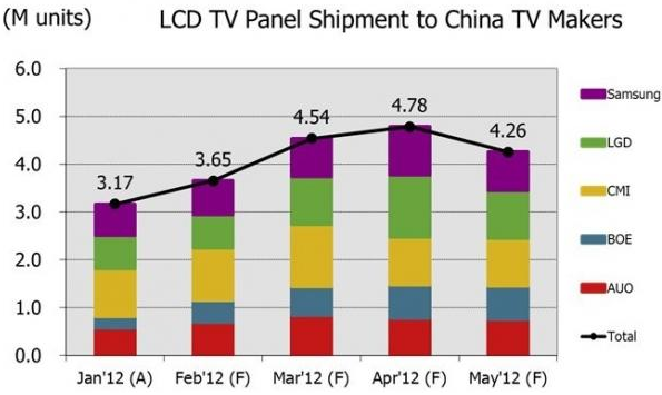 圖一、Jan’12-May’12電視面板出貨至大陸電視廠商的數量
