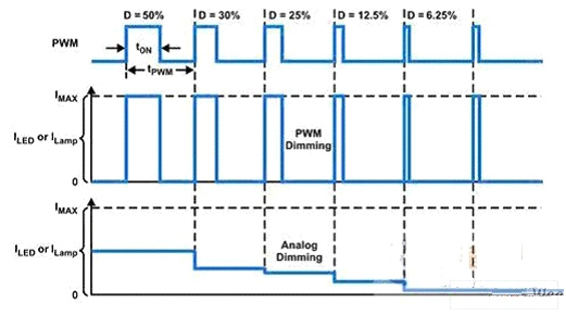 LED是一個二極管,它可以實現快速開關。它的開關速度可以高達微秒以上。是任何發光器件所無法比擬的。因此,只要把電源改成脈沖恒流源,用改變脈沖寬度的方法,就可以改變其亮度。這種方法稱為脈寬調制(PWM)調光法。下圖表示這種脈寬調制的波形。假如脈沖的周期為tpwm,脈沖寬度為 ton,那么其工作比D(或稱為孔度比)就是ton/tpwm。改變恒流源脈沖的工作比就可以改變LED的亮度。
