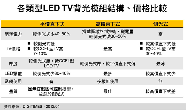 近期南韓TV業(yè)者如三星電子(Samsung Electronics)及樂(lè)金電子(LG Electronics)為吸引消費(fèi)者需求,開(kāi)發(fā)出消耗電力較低、價(jià)格亦較低的直下式LED TV機(jī)種,價(jià)差與CCFL 型LCD TV拉近至10%以內(nèi)。