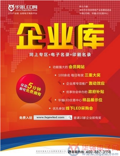 華強LED網企業庫將通過華強電子網的品牌效應,去網羅更多的LED企業,通過對企業信息流的整合、處理、分析,從而為LED企業用戶提供便捷、高效、精準的專業信息營銷服務。同時,華強LED網將通過LED中小企業商業信息主動接入以及行業上下游商業信息的連接,來實現互聯網上從產品推廣到銷售需求一體的LED產業鏈信息服務。屆時企業庫將以網絡版、印刷版、電子版三種載體呈現在大家面前,我們力求成為LED從業者的一部百科全書。