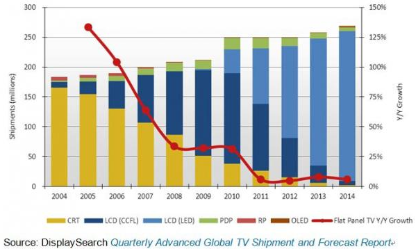 根據(jù)NPD DisplaySearch季度全球電視出貨和預(yù)測(cè)報(bào)告Quarterly Advanced Global TV Shipment and Forecast Report指出,全球電視出貨量連續(xù)兩年持平,2012年出口到西歐、日本等發(fā)達(dá)市場(chǎng)的電視總量預(yù)計(jì)將較去年下降11%,由此抵消了新興市場(chǎng)8%的年成長(zhǎng)。盡管如此,隨著CRT和等離子電視逐步淡出市場(chǎng),液晶電視將持續(xù)獲得更大市場(chǎng)份額。