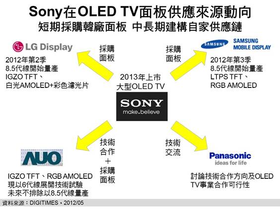2012年下半至2013年南韓兩大面板廠商因具備大尺寸OLED TV面板量產(chǎn)能力,且Sony具備龐大LCD TV面板采購力(2011年占全球10%)可作談判籌碼,因此黃銘章預期,南韓面板廠尤其是Samsung面板事業(yè),將會供應給Sony所需面板;但中長期而言,南韓三星與LG與Sony在電視市場針鋒相對,因此Sony仍會希望建構自家供應鏈,此時,具備OLED技術及大尺寸TFT產(chǎn)能可供轉換為OLED生產(chǎn)線的友達,將較有機會打入Sony OLED TV的供應鏈中。