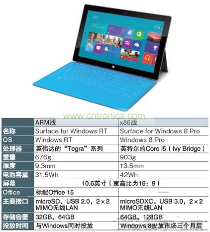 微軟的平板終端名為“Surface”,微軟讓Windows 8平板終端繼承了支持觸摸操作的桌面型計算機的名稱。新款終端備有配備ARM架構SoC的“Surface for Windows RT”,以及配備x86處理器的“Surface for Windows 8 Pro”兩款機型,前者將與Windows 8同時上市(圖1)。