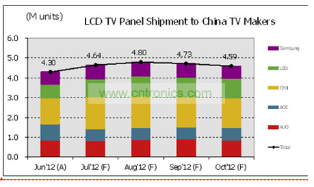 圖一、Jun’12 – Oct’12出貨至中國(guó)本土廠商電視面板數(shù)量趨勢(shì)分析