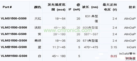 VLMx1500-GS08系列中的藍色和白色LED使用高效InGaN技術,大紅、淺橙、黃色和嫩綠色器件使用最先進的AllnGaP技術,使光輸出提高了3倍。憑借高亮度和小尺寸,VLMx1500-GS08系列LED成為音響和視頻設備,辦公設備,液晶屏、開關和標識,室內外照明,以及戶內和戶外消息牌中為指示燈和背光提供可靠性能的絕佳之選。