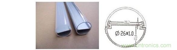 內(nèi)置電源的另一個(gè)最大缺點(diǎn)是壽命低。因?yàn)殡娫幢仨毞旁阡X管里,所以鋁管不可能做成鰭片的形式,而只能是普通的半圓柱型,頂多在表面上加上一些很淺的條形溝槽(圖4)。