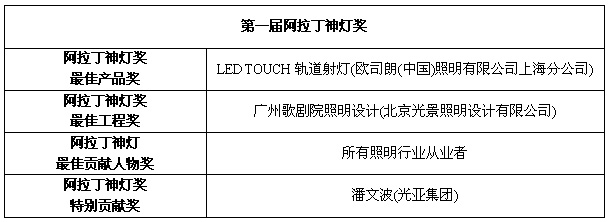 2013年6月9日,在廣州國(guó)際照明展覽會(huì)開(kāi)幕式晚宴上,同時(shí)舉行了“阿拉丁神燈獎(jiǎng)”大型頒獎(jiǎng)盛典,現(xiàn)場(chǎng)宣布了評(píng)選的最終賽果,并頒發(fā)了相關(guān)的獎(jiǎng)項(xiàng)。