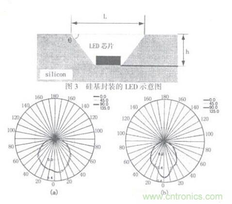 MEMS技術是隨著半導體和微電子技術的發(fā)展麗發(fā)展起來的一項新興的細微加工技術,加工尺寸從毫米到微米數(shù)量級,甚至亞微米的微小尺寸:其加T藝主要分為表面工藝和體工藝。基于硅基的體工藝又稱為體硅工藝,體硅工藝呵以在硅基體上形成高深寬比的凹稽。由于MEMS的加工尺寸很小,因此利用該技術形成的微小凹槽作為LED芯片封裝的反射腔(如圖3),將會克服目前LED芯片直接封裝在PCB板上而引起發(fā)光效率低的問題;同時由于硅具有良好的導熱特性,因此可以降低目前封裝中熱阻高的問題,從而提高LED芯片的發(fā)光效率和可靠性。圖4(a)和(b)給出了當LED芯片直接貼裝在PCB板上和貼裝在有凹槽的硅基上的發(fā)光特性。從圈中可以看出,LED貼裝在帶有凹槽的硅基上以后其發(fā)出光的發(fā)散性能得到了很大的改善,LED的發(fā)光強度提高了75%以上。