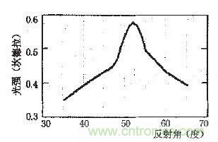 圖5為LED發(fā)射光與反射的反射角θ之間的關系,從圖中可看出當反射角為52度的時候反射光強取得最大。從理論上講,硅凹槽反射角應該設計為52度。但是,考慮到對(100)硅進行腐蝕的時候,其(111)面和(100)面會自動形成一個54.7度的角,而通過仿真分析結(jié)果可以計算。當反射角為54.7度的時候。LED的反射光強只比反射角為52度的時候小12%,而且光強分布也比較接近。因此在腐蝕凹槽的時候可以直接采用硅的(100)面和(111)面形成角度作為反射角,這可以極大的簡化加工工藝,降低制造成本,而且對LED光強的影響也不是很大。