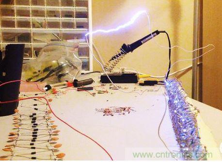 火花間隙可用彎曲的電阻和電容連接各級組成,不過你需要時刻關注這過程,通常用螺絲刀操作觸發第一個火花間隙更有效,這樣可使后續各級火花更完美。