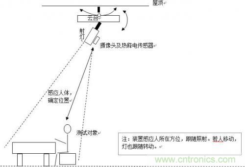 1.當有人進入房間時,云臺上的LED射燈自動打開;
