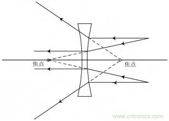 由于紫外光的散射傳播特性,UV LED的視場角和檢測器的視場角重疊的區(qū)域越大,接收到的光能量就越多,接收信噪比就越高。考慮到系統(tǒng)選用的UV?LED的視場角只有10°,為了增大收發(fā)雙方在存在視線遮擋情況下的重疊區(qū)域,需要通過光學透鏡增大發(fā)送光源的視場角。凹透鏡能夠?qū)θ肷涔馐鸢l(fā)散作用,如圖2所示,所以通過多個凹透鏡的組合并調(diào)節(jié)UV?LED和凹透鏡的距離,就可以得到滿足要求的發(fā)射視場角。