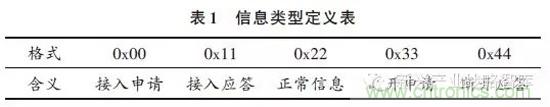 以容量為10人的紫外光語音通信系統(tǒng)為例說明數(shù)據(jù)幀結(jié)構(gòu)的設計。考慮到通常情況下人講話的語速為每分鐘160~180個漢字,在保留一定余量的情況下,假設每分鐘240個漢字,如果壓縮后的語音信號速率為4.8Kb/s,可以算出平均每個漢字時間內(nèi)的比特數(shù)為1200b。據(jù)此設計的數(shù)據(jù)幀結(jié)構(gòu)如圖3所示,其中數(shù)據(jù)的信息速率為60Kb/s,信息體長度為1200b,時隙頭長度為96b。時隙頭包括前導序列、信息類型、發(fā)送方代號和接收方代號,長度分別為72b,8b,8b和8b。每一個用戶只處理接收代號和自己的代號一致的時隙。收發(fā)雙方作為一個組合占用相鄰的兩個時隙。前導序列為0,1交替的序列,信息類型的定義如表1所示。