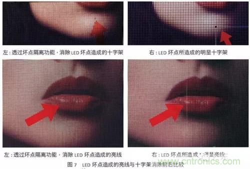 一個好的小點間距LED顯示屏必須要能消除因LED壞點所造成惱人的亮線或十字架現象,如圖7左圖所示。唯有采用具有“壞點隔離”功能(dead pixel isolation)的LED驅動芯片,才能維持小點間距LED顯示屏的正常運作,并可方便用戶彈性安排維修時程。