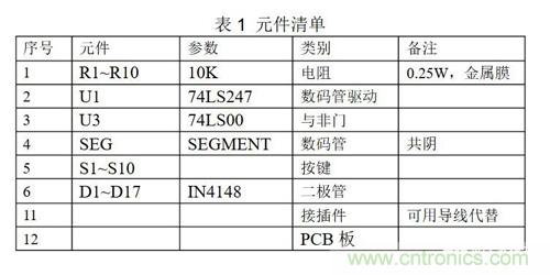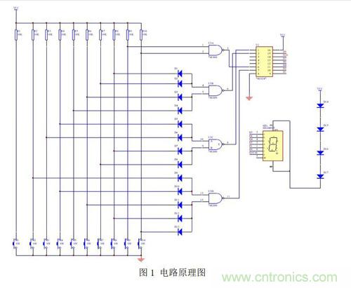如圖1所示,電路由與非門74LS00、數(shù)碼管驅(qū)動芯片74LS247組成。10個按鍵組成輸入電路,經(jīng)過與非門電路編碼后,輸入數(shù)碼管驅(qū)動芯片,驅(qū)動數(shù)碼管顯示相應的按鍵號。