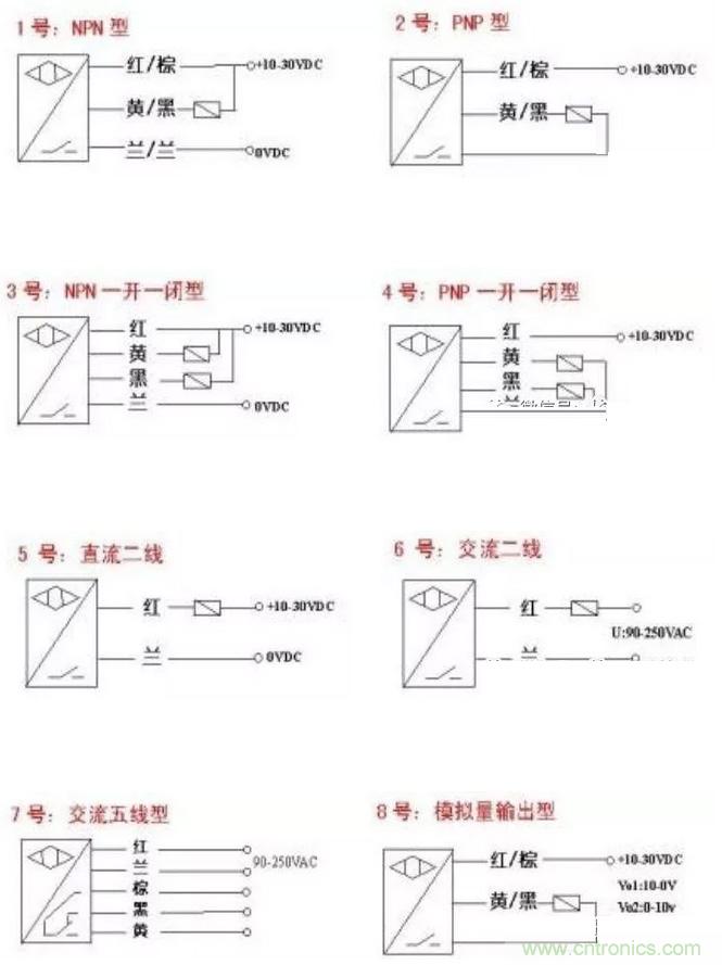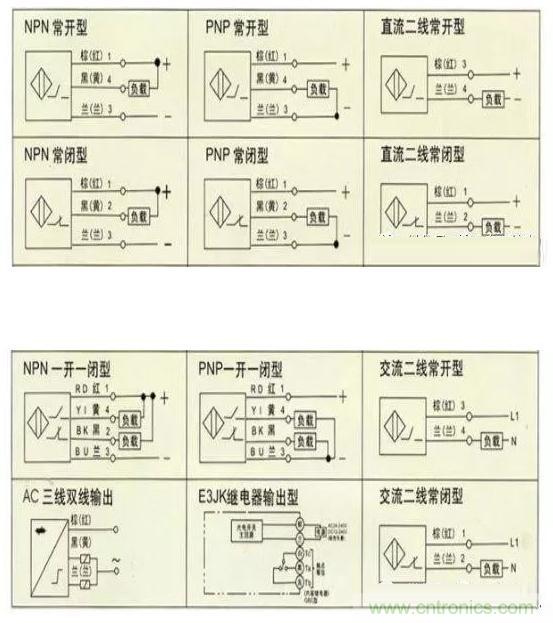 1)接近開關(guān)有兩線制和三線制之區(qū)別, 三線制接近開關(guān)又分為 NPN 型和 PNP 型,它們的接線是不同的。請見下圖所示: