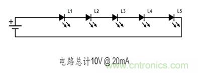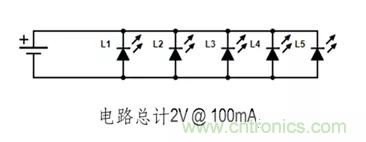 【導(dǎo)讀】LED電路的接線方式?jīng)Q定了電路正常工作所需的電壓和電流。下方兩條電路使用了五個160-1445-1-ND LED。單個LED電壓2V 20mA。如您所見, 每條電路所需的工作電壓和電流之間存在顯著差異。