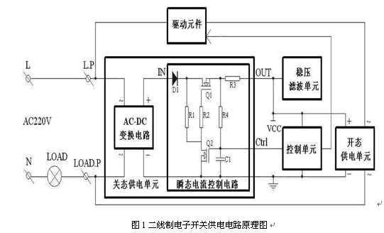基于以上問(wèn)題,本文提供了一種用于二線制電子開關(guān)的供電電路,在開關(guān)關(guān)閉時(shí)給控制電路提供很小的電流,用以維持待機(jī)工作,開關(guān)開啟的瞬間,先由控制單元控制關(guān)態(tài)供電單元,提供較大的工作電流給控制單元和驅(qū)動(dòng)元件,使開關(guān)開啟,然后轉(zhuǎn)入開態(tài)供電狀態(tài)。當(dāng)開關(guān)關(guān)閉時(shí),控制單元控制關(guān)態(tài)供電單元提前進(jìn)入大電流工作狀態(tài),迅速補(bǔ)充開關(guān)關(guān)閉瞬間控制單元和驅(qū)動(dòng)元件消耗的功率,使電源濾波電容兩端的電壓維持在額定值。有效地解決了負(fù)載燈具閃爍的問(wèn)題。