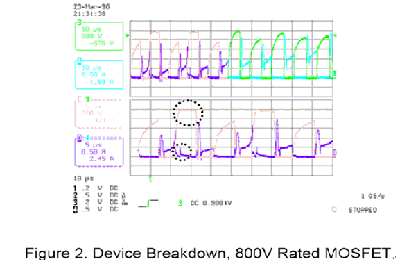 當(dāng)場效應(yīng)晶體管進(jìn)入崩潰效應(yīng)時(shí) Drain 及 Source 電壓會(huì)被嵌制在其崩潰電壓 , 而電流會(huì)經(jīng)由寄生的二極管而產(chǎn)生逆向操作電流的現(xiàn)象。如圖二所示為一典型開關(guān)式電源電路所量測到的崩潰現(xiàn)象。從圖中可看出 Drain 及 Source 的電壓 (CH3) 被箝制在 1KV 而且逆向電流 (CH4) 可清楚地被發(fā)現(xiàn)。