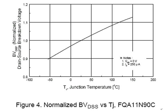 一般而言 假使 Drain 及 Source 電壓超過規(guī)格書所載明的最大額定電壓稍大一些 , 此時(shí)要讓場效應(yīng)晶體管產(chǎn)生崩潰現(xiàn)象其實(shí)是不常發(fā)生的。圖四所表示的曲線為場效應(yīng)晶體管的額定最大工作電壓 (BVDSS) vs 接合面溫度 (Tj), 其特性的表示是以正溫度特性變化 。當(dāng)接合面溫度達(dá)到 120 ° C 時(shí) , BVDSS 可達(dá)到將近 990V 。由此可知 , 在更高的接合面溫度條件下 , 場效應(yīng)晶體管需要更高的 Drain 對(duì) Source 的電壓以達(dá)到崩潰效應(yīng)產(chǎn)生的必要條件。