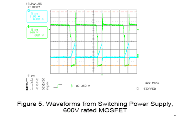 但這里必須提醒一件事 , 圖四所標(biāo)示的 BVDSS 是基于 250uA 的 ID 電流為條件所定義。在實(shí)際崩潰發(fā)生時(shí) ID 電流遠(yuǎn)大于 uA 的范圍。 因此 , 所欲達(dá)到的崩潰電壓也會(huì)比上述圖四中所推導(dǎo)的電壓要來的大的多。就實(shí)際的考量而言 , 場效應(yīng)晶體管的實(shí)際崩潰電壓一般是額定低電流崩潰電壓的 1.3 倍。以圖五為例 , 它所表示的是一個(gè)超過最大額定電壓但并未進(jìn)入崩潰現(xiàn)象的波形 ,Drain-Source 的電壓已達(dá)到 668V > 600V 但并未嵌制于崩潰效應(yīng)。