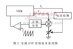 隨著VRM的深入發展,為滿足低電壓、大電流的需要,相繼提出了各種電路拓撲,如帶抽頭電感的BUCK電路、有源鉗位的BUCK電路、耦合繞組的BUCK電路、移相軟開關BUCK電路等;并有優良的控制方法問世,如V2控制、滯回控制等。以上的這些方法都甚是難以滿足電源模塊的發展需要。AVP的控制方法在適當降低負載調整率的情況下有效地改善了模塊的動態響應,在低電壓、大電流的應用場合中被人們重新認識。本文對其從理論方法進行分析,并采用新的檢測方法通過實驗證明了AVP良好的動態調節能力。