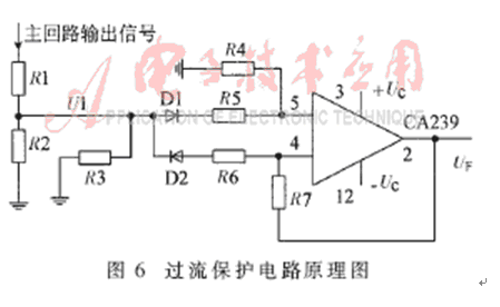 過電流保護(hù)電路的主要任務(wù)是檢測(cè)輸出電流的變化,并將其反饋到SG3525的控制端,在電流較大時(shí)可可靠關(guān)斷系統(tǒng),以避免器件的損壞。其電路原理如圖6所示。圖中,電阻R1、R2對(duì)主電路的輸出進(jìn)行采樣,當(dāng)輸出電路中電流增大到設(shè)定值時(shí),采樣電壓U1隨之增大,該信號(hào)經(jīng)CA239反饋到SG3525的+V端,封鎖PWM脈沖。