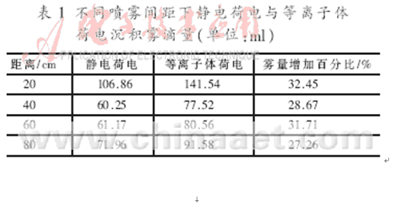 由表1可以看出,由于使用了等離子體荷電噴霧技術(shù),農(nóng)藥落在植株上的藥量有了明顯的增加,達(dá)到了設(shè)計(jì)要求。由表2可見,等離子體荷電與普通靜電噴霧相比,能在較小的放電電壓下得到較高的荷質(zhì)比。從而降低了農(nóng)藥的使用量,也減輕了對(duì)環(huán)境的污染。