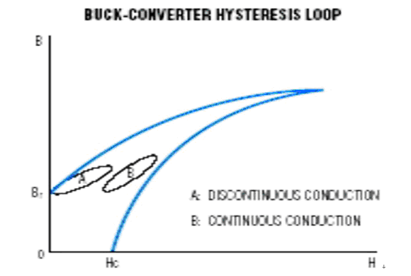 磁芯損耗主要是由于磁滯現(xiàn)象以及磁芯內(nèi)部傳導(dǎo)率或其他非線性參數(shù)的互感產(chǎn)生。在Buck拓?fù)浣Y(jié)構(gòu)中,第一象限的B-H磁滯回線對磁芯損耗影響最大。在第一象限這個局部圖中,磁滯回線顯示了電感從初始電感量過渡到峰值電感量再回到初始電感量的過程。如果開關(guān)電源穩(wěn)定工作在不連續(xù)狀態(tài),磁滯回線會從剩余電感量(Br)過渡到峰值電感量(參考圖1)。如果開關(guān)電源工作在連續(xù)狀態(tài),那么磁滯回線將會從直流偏置點(diǎn)上升到曲線峰值,再回到直流偏置點(diǎn)。通過實(shí)驗(yàn)可以確定磁滯回線的精確曲線形狀(基本上是橢圓曲線)。